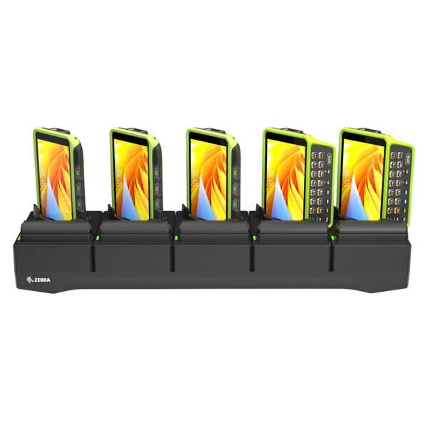 Пятислотовая зарядная база с зарядным устройством для запасных аккумуляторов для Zebra WT5400/WT6400, позволяет заряжать 5 носимых терминалов и 5 запасных аккумуляторов.
