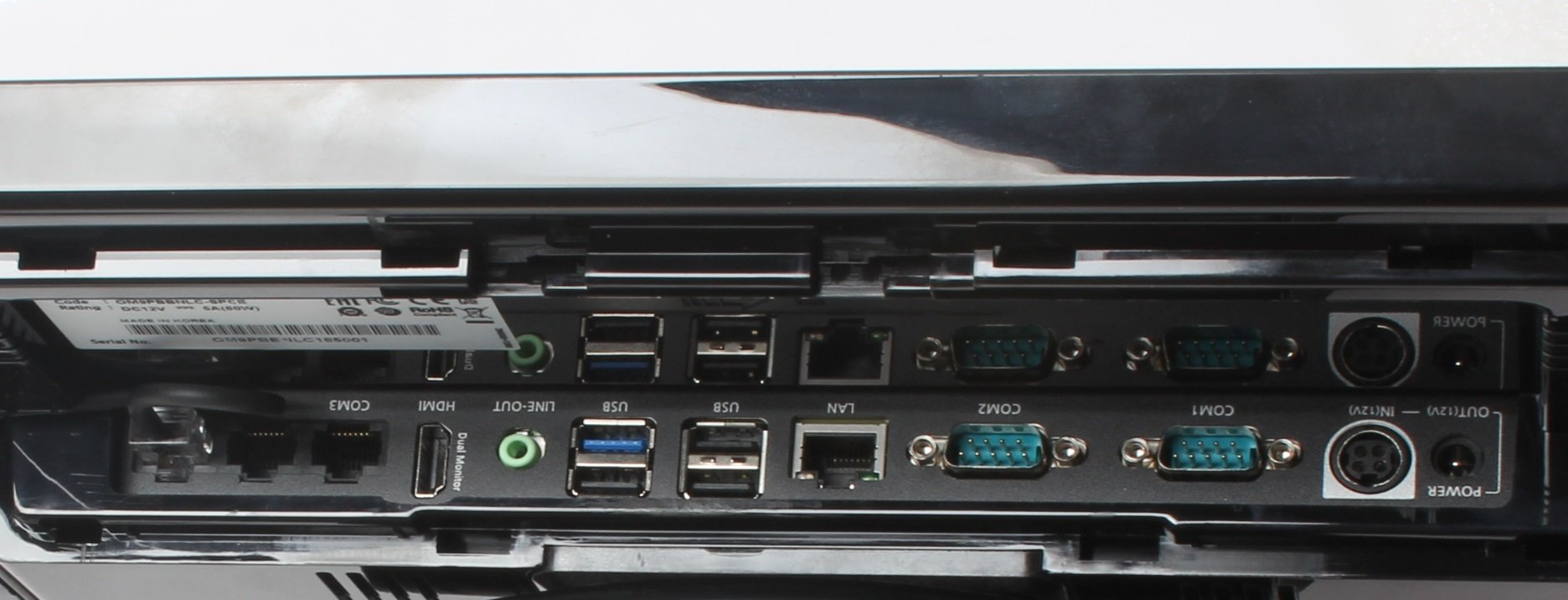 | Интерфейсные порты | HDMI - 1 шт., LAN - 1 шт. (Realtek RTL8111F PCIe GbE Controller), COM - 4 шт. (DSUB -9p x 3шт. / RJ-45 x 1шт.) питание на COM3 (установки в BIOS), PS/2 - 1 шт. (Keyboard), USB - 6 шт.(4 x USB3.0&2.0 + 2 х USB 2.0) (Сбоку), AUDIO - Line-Out, Mic-In, Динамик - 1 шт. (1W) (встроенный динамик) |